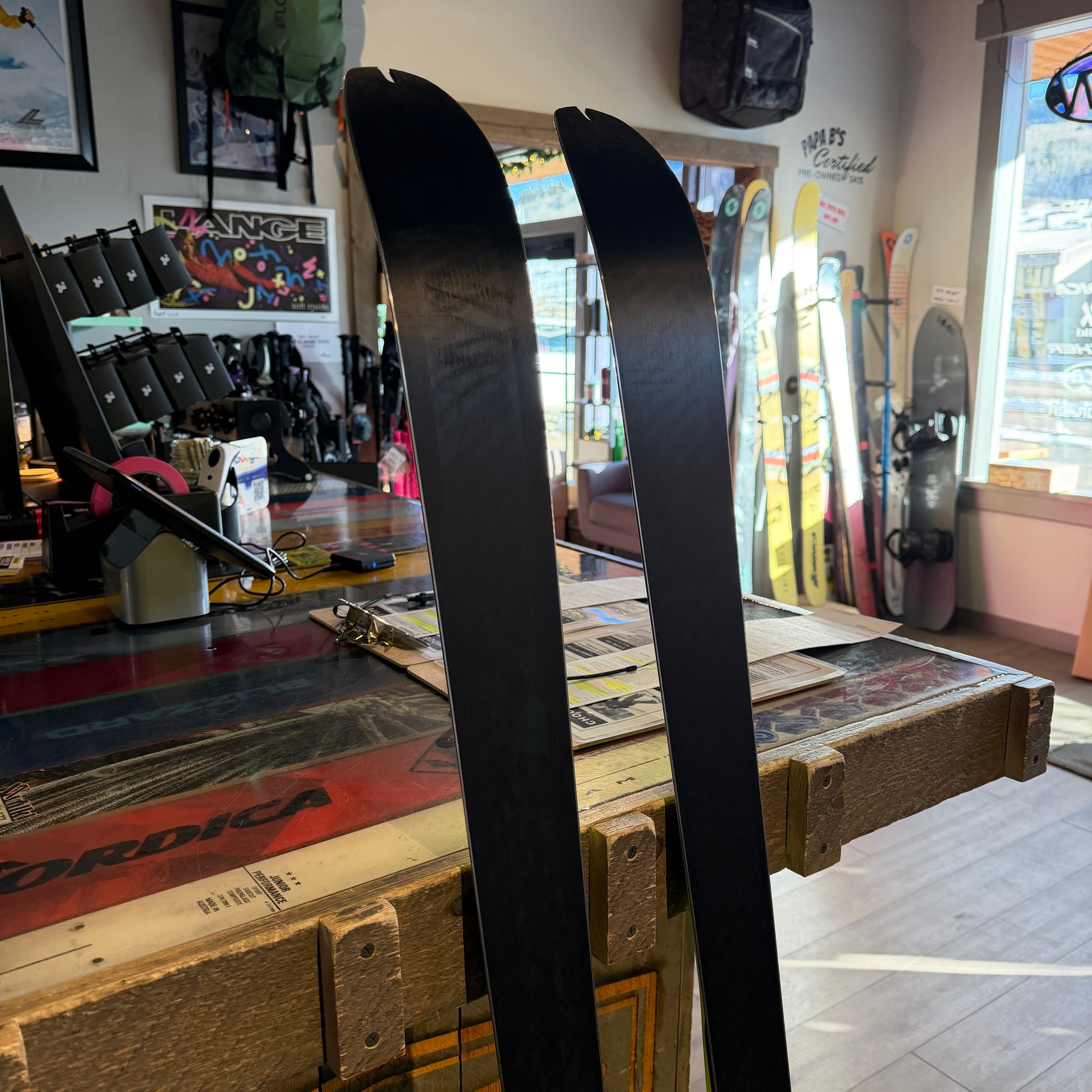 This ski is in NEW condition. 161 cm. 96-65-79. 21m radius. Mounted to a 263mm boot sole. Want to see more close-up photos of the base? Shoot a text to 970-390-6224, but pics are the actual skis